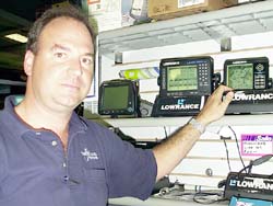Steve Felix of Tri-State Marine, shows off some of the boat dealerships Lowrance GPS models.