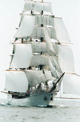 Suddenly, off the starboard bow emerging from the haze, the bark Europa