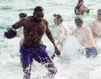 Last year, more than 1,000 people braved 39-degree Bay waters in the Polar Plunge, including, below, Nathaniel Knoll and Bay Weekly general manager Alex Knoll.
