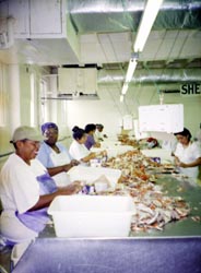 Once filled, containers of crabmeat, fresh and pasteurized, are sent swiftly to the packing room. There, Leona Travers and Shelley Neil work "on-line" together and weigh in with their talent. They are the "final word" they say, "checking for bone," or rather making sure there isn't any, before it's sent out to you, the consumer. They're good at their job, all smiles at the finished product, for they know that each picker's number is on the bottom of containers and will identify the culprit, who'll hear about it, if the meat is less than "shell free."
