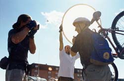 Morris photographs Annapolis Mayor Dean Johnson while cycling partner Tim Hovey positions a light diffuser.