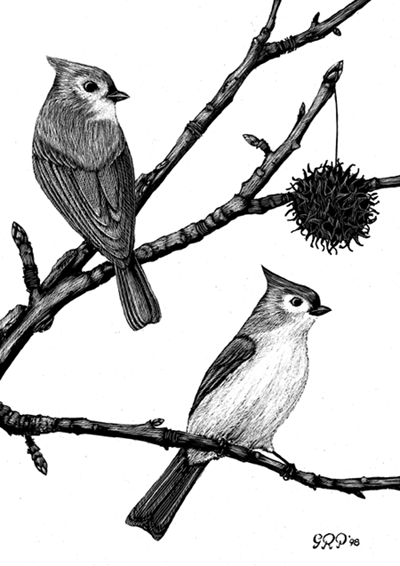 Titmice (or mouses) have small crests like cardinals do. Hence the adjective tufted. Their colors are gray and white with a pale buff patch on their sides.
