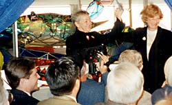 Artist Jackie Leatherbury Douglass and County Executive Janet Owens introduce the restored glass crab at BWI.