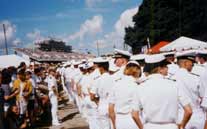 Candy in hand or pocket, into the stadium came the sea of white caps, like a fast-moving tide, a fluid formation of young men and women blanketing the field of play. Above the field of play, you notice the names: Chateau Thierry. Coral Sea. Santa Cruz Islands. The names that line Memorial Stadium are not just destinations. Belleau Wood. Java Sea. Wake. Midway, Guadal Canal. Pearl Harbor. They are a legacy of battles fought and lives lost in the service of our country.