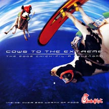 Each month features cows on the brink of becoming burger, taking on extreme sports like freestyle dirtbike, bungee jumping, street luge and more. Corny but funny captions make pun-filled quips on each scene. An added bonus: coupons for free food each month.