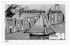 This stamp is such a package that its even got a name. Greetings from Maryland issued April 4 by Gov. Parris Glendening and Annapolis Mayor Ellen Moyer was inspired by tourist postcards of the 1930s and 40s. These cards depicted local scenes inside the large letters that spelled out the name of the place or attraction.