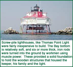 The screw-pile lighthouse was relatively inexpensive to build when Thomas Point Light was constructed in 1875. Thick iron rods with screw-like spirals cut or forged into their lower ends were essentially turned into the ground by four or more workmen using muscle power and a kind of lever. The Bay bottom is relatively soft, and six or more of these iron rods could be screwed far enough into the substrate to provide a solid foundation of iron pilings. These pilings hold the wrought iron foundation for the ornate wooden structure that would house the keeper, and in the early days, his wife and children. In most cases, the wooden walls of the cottages were fabricated on land, then taken by boat to the screw-pile foundation for assembly.