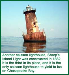 The Bloody Point Light at the mouth of Eastern Bay, an inlet just south of Kent Island, is a cast iron tower mounted on a foundation of iron and concrete. The caisson design goes back to the bridge pilings used to construct Londons Westminster Bridge in the first half of the 18th century.