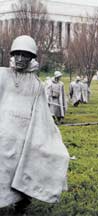 | In the Korean War Memorial, soldiers march warily through a field of juniper. |