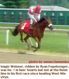 Return he did, 10 months after catching the West Nile bug. Entered for the sixth race at Laurel Park on July 24, Magic Weisner was a popular favorite, with odds as low as 6-5. With people in the grandstand cheering for him, he began his comeback to the form that made him a Maryland sporting namesake.