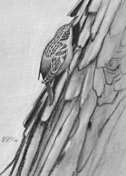 The brown creeper is a short, slender bird with a downward curved bill and cryptically patterned brown and tan plumage. The long, curved bill is good for probing under bark for insects and spiders. Like the woodpeckers, the creeper has very stiff tail feathers.