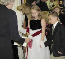 Mason overlooked his truculence. She launched into her comedy routine, and the class responding with predictable mirth. After a very funny line and peals of laughter, the rebels shoulders quivered. With visible effort, he stilled his body into sullenness. Mason continued on a roll, with the class eating out of her hand. Again and again, the boy struggled to stifle laughs. He battled for another 10 minutes before capitulating. Turning in his seat, he watched as well as listened. Now in his third year of cotillion, this boy looks forward to the classes. Not only Mason won this Round. Graduation Night On February 28, Tidewater Cotillion students show their stuff. When the younger class teaches their parents to dance, ambitious pint-sized sons try to pull off the underarm turn with their 5'8" mothers. They find the side chassé works much better. Daughters giggle as they dance with their dads. The older students put their knowledge to the test with a dinner party at the Old South Country Club in Lothian. The children pair up, the boys escorting and seating the girls on their right. Under dimmed lights and in a formal setting, they deal with an assortment of cutlery. The veterans again stand out. When the salad arrives, they know to start with the outside fork. New students watch and emulate. Pleasant conversation fills the club. These kids are at ease. Only one surprise arrives. Many new students dont know what to make of the sorbet delivered between the salad and main course. Its to cleanse your palate, silly, explains a girl. Everyone eats it. Its sweet and its not escargot. The kids make Mason proud. When a girl excuses herself, all the boys stand for her departure and her return. Chaperones applaud. After dinner, when these students dance with parents, height mismatches are fewer. Boys whirl and twirl their mothers across the floor, and dads get left in the dust. Nicholas Bowen, a sixth grader in his fifth year of cotillion, admits he likes cotillion. Lots of my friends from school have to come. I like the dancing, especially the jitterbug. I also like meeting new people. Another boy, a seventh grader and a cotillion veteran, wants to remain anonymous. I dont want my friends at school to think Im a sissy for liking cotillion. They think its stupid, but I like it, he confesses. New students Luke and Krista have divergent opinions. Krista, like most girls, is a convert. I definitely want to come back next year. I want to be more comfortable when I get older dancing with boys, she says. Luke struggles. It takes more than one season for the average boy to feel comfortable, even longer to admit that he might enjoy cotillion. Well, I might come back next year, he hedges. Dancing with girls wasnt too bad, but it wasnt great, reserving enthusiasm for the drinks and cookies. Lukes fate, of course, rests with his mother. Almaraz says she has already seen improvements in how he responds to adults. She wants for her children the self-confidence she has seen in cotillion veterans, but shell have to decide if the fight is worth it. Fowler, however, has no reservations. She plans to pay cotillion tuition for both Krista and next year for younger brother Zachary. Manners Around the Bay Cotillion is slowly coming to Bay Country. Maryland Hall for the Creative Arts offers Cotillion with A Twist every other Friday night for five sessions January through March for children in fifth through eighth grade. This year, third and fourth graders attended Mini Cotillion on two Saturday evenings in January.