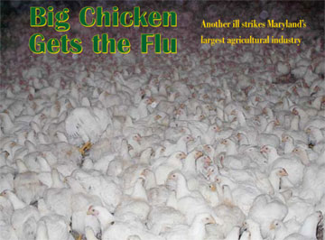 We didnt last long in Charlies dimly lit chicken house: The word stench doesnt come close to describing the overpowering blast of dusty ammonia that seeps into eyes, throat and lungs. Within a few minutes, no more than 10, Charlie turned to us with his shirt over his mouth to mumble, Guys, I cant take it anymore. As the door closed behind us, I realized that these chickens had spent the last eight weeks essentially, their lifetimes in a squalor we couldnt stand for 15 minutes. Yet were surprised when disease breaks out. When you have an enormous number of birds in disgusting conditions, youre setting yourself up for some really horrible things, says Robert Sprinkle, a physician and associate professor of public policy at the University of Maryland School of Public Affairs. You can really get creamed. This most recent case of bird flu broke out first in Delaware and then, independently, in Maryland, according to Maryland Department of Agriculture officials. Why? Well probably never know. But generally the Eastern Shores poultry industry is ripe for such disasters. Avian influenza and other epidemics are part simple, part complex. Whenever a species is packed densely together in squalid conditions, there is a high risk for contagious disease wiping out nearly the entire population. To guard against catastrophic epidemics, farmers heavily vaccinate their flocks just as we vaccinate ourselves. Thats an imperfect solution, as many of us know. Vaccination can only defend against strains of the virus from which that vaccine was developed. Farmers, like all flu vaccine users, can only hope that the strain of virus that comes around is the one they have vaccinated against. Antibiotics and antimicrobials, heavily applied as insurance against other diseases, come with problems as well. Their very success encourages the evolution of disease, as only the fittest bacteria live and reproduce, passing their resistance to future generations. Next time around, farmers need stronger medicinal remedies. In a worst-case scenario, an outbreak wipes out chicken houses, locks down the Eastern Shore, closes the Bay Bridge and devastates Marylands economy. This scenario is not a matter of prophesy, but a fair description of events that have already transpired, most notably in the Shenandoah Valley in 2002, where avian influenza wiped out 197 farms and five million birds. Unless changes are made, the future could see such occurrences with increasing regularity. Jumping Species In one critical way, the Eastern Shore dodged a bullet with the most recent Delmarva outbreak. The H7 virus on Marylands lower Shore is not the same one that swept through southeast Asia, jumping species and killing 23 people. The next time avian influenza rears its ugly head on the Eastern Shore, theres no guarantee it wont be a form that jumps to humans. The avian flu virus that hit the Eastern Shore this winter spreads like the common flus were used to airborne and passing from host to host. So too does the strain in southeast Asia. These viruses not only mutate but are also capable of traveling great distances. The International Society for Infectious Diseases reported March 19 that research by Japans National Institute of Animal Health has shown that the gene sequence of the bird flu virus found in Japan and that found in South Korea are virtually the same. Many international experts claim that the virus was carried by migratory birds, but there is no way to prove a direct connection. Perdue spokeswoman Tita Cherrier agrees with Maryland officials who cite migratory birds as the likely cause of Marylands outbreak. Again, proving or disproving such a claim is next to impossible. Some flu strains jump species to humans and some do not, but by varying degrees each punishes the Eastern Shore economy and threatens to alter a way of life. The February and March outbreak, compared to its potential consequences, was mild. In Maryland, only one farm has so far been infected. But 368,000 birds on three farms owned by one unlucky farmer a fraction of the total birds on the shore were euthanized in their houses to prevent the infections spread. As this outbreak of avian influenza dies down, leaving chickens and farmers its only victims, dare we wait for more serious consequences before asking the Delmarva poultry industry and ourselves some hard questions? For public policy professor Sprinkle, this outbreak sent a clear message: Now is the time to re-examine farming practices on the Eastern Shore. The Avian Flu Express In the meantime, avian influenza spreads across the globe. Cases continue to be reported in southeast Asia and have spread as far as India and Japan. British Columbia, too, has seen a second outbreak after they thought it was contained, resulting in the preventive slaughter of 36,000 birds. The Netherlands, too, has gassed 22,000 chickens to contain an outbreak.