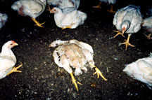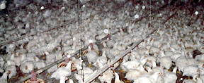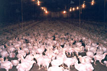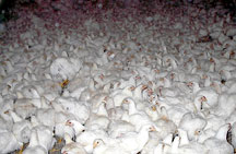 ![]() by Ryan Grim As we stepped through the side door of a long chicken house on Marylands Eastern Shore, thousands of birds tried to scatter. Scattering, though, was not an option for any one of these 30,000 chickens packed into a house 500 by 50 feet long. Much like blue crabs rustling in a bushel, they bounced off each other for a frightened moment. Then they settled and returned to their favorite pastime, rhythmic head-bobbing.