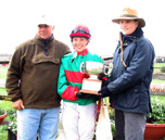 Fifteen-year-old Chelsea Secor, center, rode April Showers in the Large Pony race to win the Raymond Ruppert Cup at this years Marlborough Hunt Races at Roedown Farm. With her are J.B. Secor and Casey Calver. |