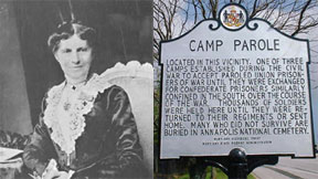 | Red Cross founder Clara Barton, below, tended wounded parolees prisoners of war awaiting release at Camp Parole, shown above in one of the only known photos. |