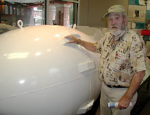 Burton with a model of Fat Boy, the bomb dropped on Nagasaki during World War II. |