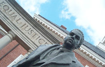 The Thurgood Marshall statue stands tall in front of the State House, flanked by Equal Justice Under Law pillars and etched marble bearing his accomplishments, as well as two schoolchildren statues that sit on a nearby bench, looking toward Marshall, in dedication to Brown v. Board of Education.