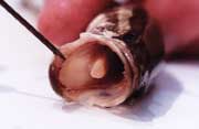 The northern snakehead, with jaws opening as wide as its body, seizes its prey with tiny sharp teeth angled inward.