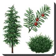 The yew is the commonest dark-green needle evergreen used in landscaping, appearing in both shrub and small tree forms. The needles are flat to the touch, and the plants are generally very dense and compact. They differ greatly from junipers, which tend to have spiny needles, are blue-green in color and generally grow much larger than yews.