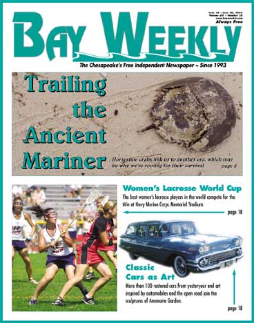 Departments: Way Downstream ~ One of 12 hearings on saving menhaden, a link in the Bays protein chain, comes to Annapolis Shooting wild turkeys and tame gulls Navy work is too toxic, OSHA says Centreville cleans up its toxic history Horn Point Lab at Cambridge plays around with sturgeon and last but not least, this weeks Creature Feature: Cambodias Mekong giant catfish get a new lease on life.