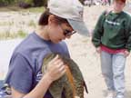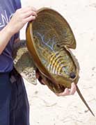 She also fielded questions about the horseshoe crabs: “Do they fight?” “Can the man fertilize more than one female?” And, most important, “What’s in that box?” She reached into a container and brought out a punch bowl-sized shell of a female crab, perhaps 18 inches long. “Whoa!” said a boy, startled.
