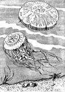 Lets take a closer look at the moon jellyfish shown at the top of the accompanying illustration (the other is our sea nettle). The moon, more common in Delaware Bay, is rather flat, forming a disk, which is referred to as a bell or umbrella. The outer margin of the tawny-shaded bell is divided into eight equal parts, each bearing many small tentacles as opposed to the few long tentacles of our common jellyfishes. By late summer, it displays a distinctive pink shade.