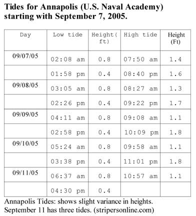 Use these to determine the potential storm surge. Find either the predicted tide or the actual water level at NOAA (www.coops.nos.noaa.gov/tides05 ) or the Maryland Department of Natural Resources: www.dnr.state.md.us/fisheries/access/tide_finder.html.