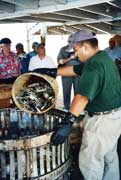 Self-employed crab potters and trotliners off-load their booty of beautiful swimmers onto Claytons prime Cambridge Choptank riverfront dock. There a Clayton worker culls and grades them, setting aside the best for the table trade. Crabs at least five and three-quarters inches point to point are destined for restaurants, where theyll be steamed and devoured in copious quantity. Crabs with no live trade market females and legal, smaller male crabs get cooked.