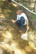 Naturalist Elaine Friebele’s group of nine followed her like ducklings down a wooded slope to the stream, where fifth-grader Brian Hutson promptly caught a leopard frog lush forest-green with a yellow stripe down its side and large hearing discs on either side of its head.