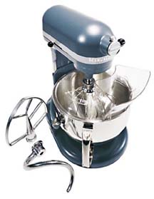 All this whets my palate, but none stirs my soul like the prospect of a KitchenAid Professional 600 series 10-speed, six-quart stand mixer with whisk, flat beater and dough hook attachments. Mmmm. The 31-pound machine eats up nearly one-and-a-half cubic feet of precious countertop, but no matter. A two-piece plastic pouring shield contains the melee within as the 575-watt motor churns away through a direct-drive, steel gear transmission. If worked too hard, the machine protects itself with auto shut-off. My eager stomach roils in anticipation.