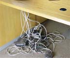 A lot of solutions are advertised: workstations with “decorative molded side panels” that cover computer cables; desks that feature hollow legs and tamper resistant raceways; something called WireTracks that turns “every piece of baseboard molding, chair rail molding and door casing in your house or office into hidden wiring channels.” It’s installed in 17 easy steps requiring safety goggles, protective gloves, dust mask, power saw and new baseboards over the tracks. Uh-huh.
