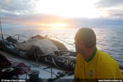 ABN AMRO TWO, the last boat past Fernando de Noronha, discovered and dispatched a sailor’s jinx, a rabbit on board the race boat, in the guise of the Nesquick bunny. Racer Sebastien Josse ripped the smiling rabbit off a tin of the hot chocolate and sacrificed it to the sea. Perhaps his jinx-breaker worked, because shortly afterward, as they raced to the Chesapeake, a rainbow opened in the sky.