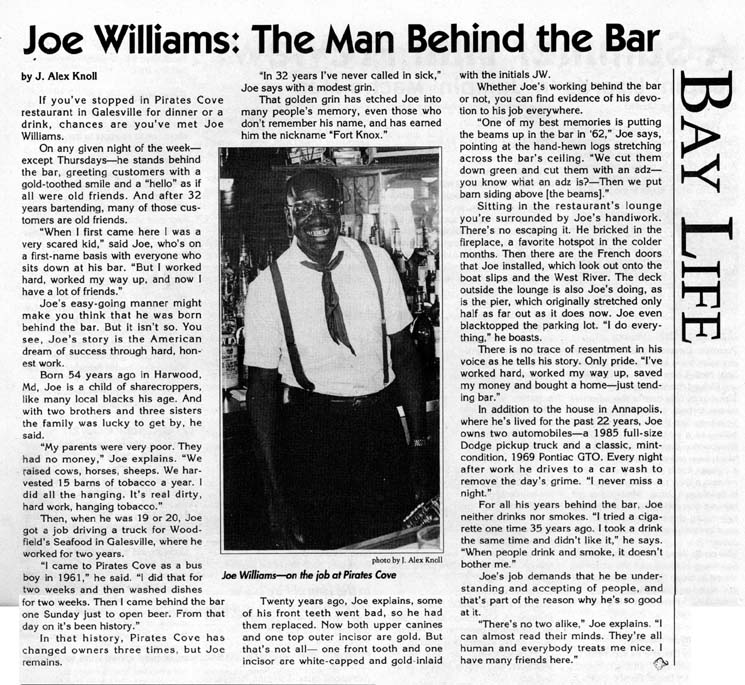 I remember the first time I met Joe Williams back in the summer of 1992. I was fresh out of college and recently relocated to Chesapeake Bay while I tried to figure out what to do with my life. Like many recent grads, I took a job waiting tables, in this case at Pirates Cove, where Joe was already a longtime fixture behind the bar.