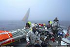 ABN AMRO ONE suffered the first breakdown of the race: first a broken daggerboard, then a fluid leak from the canting keel. A quick fill and a spare daggerboard put the boat back to 100 percent. Brasil 1 also struggled with hydraulic leaks and had to pump the keel every half hour to keep it canted.