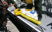 In side-scan sonar searches, the towfish, a yellow sonar device that emits sound waves 90 feet to both the left and right, attaches to a vessel by a black cable ranging from 90 to 600 feet long. From its position behind the boat, the sonar detects objects in the waters and sends pictures to a computer monitor aboard. However, boats can only travel a maximum of 4.5 knots for best resolution, making progress slow.