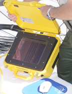 When searching the Bay for lost bodies, Maryland Natural Resource Police scour the area by trailing a side-scan sonar unit, above, which reveals submerged items on a computer monitor aboard ship, right.