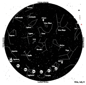 Friday evening the moon is barely three degrees from Antares, the red supergiant marking the heart of Scorpius. Meaning “rival of Ares” and called the “rival of Mars,” this star actually outshines the red planet, which sets in the west just after darkness as Antares appears in the south.