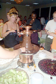 The upstairs dessert room features a chocolate fountain surrounded by cakes and petit fours plus a cordials station.
