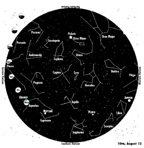 Thursday’s “big” moon rises in the southeast at 9:10, about one-half hour after sunset, and is only five percent shy of full. Armed with a piece of paper, roll it into a telescope-like tube and target the moon; tighten or loosen your tube until it’s the radius of the moon; then tape it in place. Measure the diameter with a ruler. Hour by hour, as the moon climbs, it “shrinks” until its zenith, around 2am Friday morning. Additional sightings and measurements over that time will all be the same.