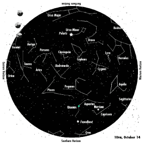 This bluish-white, first-magnitude star is the 17th brightest, 14 times brighter than our sun and only 25 light years distant. Compared to our 4.5 billion-year-old sun, Fomalhaut is a relative newborn at 200 million years.