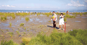 Barren Island is well named. It is treeless, flat, sandy and uninhabited by people anyway. Shore birds love it. So did Natalie and Teresa. Eager to set to work, and with the help of Seibel and Gulden, they first laid a grid on the sand to ensure that the plants would be properly spaced. Then they planted a tuft of marsh grass in each space, tucking it in carefully. When one grid was complete, they would flip the frame over and begin work on the adjacent grid. The sky was a cheerful blue, but the day was hot and the terrain muddy.