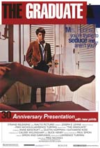 Benjamin’s a little worried about his future. Home in L.A. after college, adrift and bewildered by the world he’s inherited, Benjamin (Dustin Hoffman) finds himself seduced into an affair with the sexually frustrated wife of his father’s business partner (a flawless Anne Bancroft, who died in June of 2005). The naïve, directionless Benjamin is easily, willingly exploited by the decadent, acerbic Mrs. Robinson, herself a tragic figure of unhappy marriage. Benjamin can’t understand or anticipate the wrath he unleashes when he falls in love with Mrs. Robinson’s college-age daughter, Elaine.