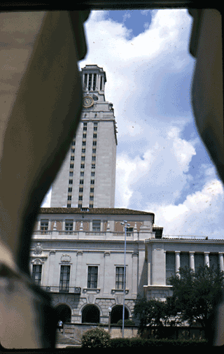 • • • Gary was a large guy, dark hair, a square face; he had grown up hunting and knew guns. On the east slope from the tower, policemen hunkered on the edges of the terraced lawn. Then we knew what was happening. We realized that if we could see the tower, the shooter there could see us. Police handguns wouldn’t reach the top of the tower, Gary explained. • • • We turned back to make our way around big, blocking Garrison. We needed to see what was happening. That was at the plaza on the south side of the tower. People hustling between the buildings were in clear view of the tower. Maybe they didn’t understand their peril. In the center of a flat, cemented plaza beneath the tower stood a tall flagpole flying the Stars and Stripes. Opposite the tower, the end of the plaza was framed by a colonnade baluster supported by a retaining wall. Protected by the wall, Gary and I worked our way to the bottom of the wide stairs ending the plaza. A waist-high hedge held us to the wall; it was tough to negotiate with my stiff leg. I thought about my mother and what she would think. Later she confided, “I knew you had sought a safe place.” In reality, I’d sought the action. The stairs above us led to a grassy lawn, then to a large reflection pond that sloped down again, the terracing effect leading to a view of downtown Austin and the state capitol. The view was violated by a victim shot on the far side of the reflection pond, 500 yards distant. “With that magnum, the sniper can accurately shoot past that far terrace,” Gary explained. It was a half-mile away. That meant that anyone walking on the street, on the western side of the plaza, was in easy range of the sniper. Guadelupe Street had a series of small stores; people stepping out would be unaware of their utter vulnerability. Some people had already been killed; store windows were rent with large and small bullet holes in the plate glass. • • • Reaching the southeast edge of the plaza, we saw two bodies, one perhaps 20 feet from the far edge of the stairs. A woman was crouched at the bottom of the flagpole, its concrete base and thick taper her sole protection. Tucked behind the wall and trapped by the hedge, we could see people across the stairs, a mirror of our cluster free of bushes, scoping out the plaza and the tower. Bob Zahn was among them. He had to have crossed the stairs in plain view of the sniper to get there. A student and visiting professor, we later learned, had been killed on the plaza; a policeman was shot through the balusters near where Bob was huddled. One woman lying on the plaza was still alive. The cluster seemed to be trying to figure out what to do. They were afraid to go out to get the wounded woman. Behind them, a man ripped off his shirt. When it seemed the gunshots were on the far side of the tower, the man bounded the stairs to the woman. He struggled to lift her up. Bob Zahn the comedian but not others joined him to carry her down to safety. You can never predict who has courage. The first rescuer was an ex-Marine. He was later fired from his work with a construction company because he had gone off the job to get to the tower. • • • The sniper, Charles Whitman, was also ex-military, ex-Vietnam. He reportedly had a small, undiagnosed brain tumor, but that didn’t fully explain the random carnage. He killed 14 that day and wounded 31. Romero Martinez and Houston McCoy from the Austin Police Department took the elevator up the tower, then climbed the remaining stairs to the reception area for the observation deck. Whitman was on the northwest corner of the deck, looking toward Guadelupe Street. The patrolmen stepped out and around the eastern corner. Martinez shot first. Ninety minutes after the first pop, there was silence from the tower. Silence.