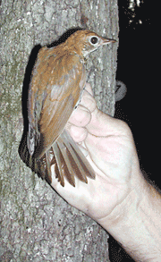 Finding Old FriendsSince 1990, Jug Bay has banded almost 2,200 birds of 60 different species. Their summer nets have also recaptured more than 1,100 birds that were previously banded, catching about half of those more than once. By collecting specific information about each bird, scientists gain insight into their habits and needs. Though years of data from many sites must be studied to correctly interpret nationwide trends, Jug Bay’s results show promise. The woodthrush population is burgeoning. Occasionally, old friends have stopped by. Ovenbirds, large warblers with a single orange stripe bordered in black on their crowns, fill the late spring and summer woods with their loud crescendo: cher-tee, cher-tee, cher-tee. One ovenbird, first banded at Jug Bay as an adult in 1994, was recaptured in 1996 and 2003, making this repeat visitor at least 10 years old. Fifteen red-eyed vireos, aged five to eight years, returned to Jug Bay in 2005 to breed. In 2006, a female red-eyed vireo first banded in 1997 was recaptured, as she had been several times before. “This bird, which weighs about 16 grams or roughly the weight of three nickels and a penny, winters in northern South America some 2,000 miles away,” Teliak said. “She has been going 4,000 miles roundtrip each year for the past 10 years so she can breed at Jug Bay.” What keeps these birds coming back?
