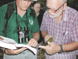 Most likely, it’s the expansive woodlands. Loss of large parcels of forest can pose real problems for some of these birds. Seventeen years of bird nesting data have shown that ovenbirds are one of the most sensitive of the woodland nesters to reduced forest size. Below 30 hectares, or about 74 acres, their breeding success drops off precipitously. Half of Jug Bay’s 1,400 acres are wooded, and both the ovenbirds and wood thrushes who need 20 to 25 hectares are thriving. Besides adding their songs and beauty to our lives, warblers and thrushes keep the insect population down by eating vast quantities of caterpillars, ants, beetles and other bugs. Reasons for ReturningWaiting for the last net run before noon, Swarth and I sat on a bench overlooking the marsh. The pale-yellow wild rice barely moved in the humid air. Swarth pointed out a katydid eating one of the male flowers. “We just began noticing this and want to study it,” he said. Julia Hagemeyer joined us, looking about with unmasked delight. Pointing to a nearby tree she asked, “What is that?” Alerted to the white froth on an alder branch, we watched a number of large black ants swarming over the bubbly mass. “Aphids,” said Swarth. “They draw the juices out of the branch and the ants feed on it; the ants have their own aphid farm.” “You see something different every time you visit,” continued Swarth. “When you go to a place like Blackwater National Wildlife Refuge, you can be pretty sure what you will see: eagles and herons and waterfowl. But here things are more subtle. You just have to keep coming back.” A year has passed. Spring blossoms toward summer; migration is underway. It is time to go back. It’s time to hold a bird again. Volunteers (eight to 10 per day, ages 10 and older) are welcome to join Jug Bay’s Bird Banding Study beginning 6am-noon Thursday, May 24, and continuing through July (Sundays June 3, 24; July 15, 31; Tuesdays: June 12; July 3, 24). Wear sturdy shoes and long pants for hiking on woodland trails. Nets open at 6am; first net run is 6:50am. Volunteers meet at junction of Railroad Bed Trail and Otter Trail at 6:40am. Call 48 hours in advance of banding morning. Mike Quinlan: 301-805-4278; [email protected]; www.jugbay.org. Dotty Holcomb Doherty of Annapolis is a regular contributor to Bay Weekly, specializing in birds and children. Her last story (Vol. xv, No. 17: April 26) introduced Children’s Theater impresario Jackie Waymire.