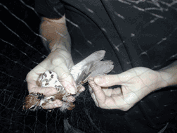 “It’s worth getting up at 4:45am,” said Julia, a freshman at Severna Park High. “We got here early, so we took a walk along the Railroad Bed Trail and were watching ospreys when a hummingbird came by and was eating the wild rice flowers.” “There’s always a reason to get up at o-dark 30,” said Teliak. “You come here knowing you’re going to get hot and sweaty, and you know you’ll get wood thrush and yellowthroats and wrens, but there’s always something that makes it worth getting up so early. Today, it was a juvenile hooded warbler.” We had just begun the second of six rounds when we came upon the recently hatched hooded warbler, a species not regularly caught. His yellow face peered out from his black balaclava hood above his equally yellow breast and olive-green back. His outer tail feathers flashed with white. Earlier in the year, the presence of brown-headed cowbirds caused the researchers to fear for the breeding success of some of the smaller birds. Cowbirds parasitize smaller songbirds by laying their eggs in the warblers’ nests. The larger eggs of the cowbirds hatch earlier, and the young warblers often do not survive. The little warbler was fortunate; his parents had beaten the odds. Unwelcome SurpriseAnticipation gets the banders up early, but the surprises are not always welcome. With the heat pressing through the still foliage, we walked briskly to each row of nets, not wanting the birds entangled too long. Heat can exhaust a bird in a net, though none had been affected so far. Teliak, mopping his face with a towel, remained resolute. “The safety of the birds is paramount,” he said. “Sometimes we have even found a box turtle eating a bird in the net.” I gasped, having never heard of this before. Keri Parker, who had worked at the Powdermill Nature Reserve’s bird banding station in Rector, Pennsylvania, had seen even more. “And not only turtles,” said Parker. “I’ve seen chipmunks jumping for birds, and even deer walking net lines munching at birds.” Rounding the corner to the next net, we looked at each other in amazement when Quinlan called, “We’ve got a turtle eating a bird here.” Deft hands quickly freed the desperate wood thrush hanging low in the bottom of the net. Chris Swarth, the director of Jug Bay Wetlands Sanctuary, who began the banding program here 16 years ago, has seen three birds killed by turtles. Fortunately for this thrush, rescuers arrived in time. Removing the hungry turtle, the banders instantly released the wood thrush, not wanting to subject the bird to any further stress by weighing and measuring it. Later, Swarth asked if anyone noticed the plumage, whether it had the buffy-edged head and back feathers of a juvenile or the clean rusty wash of an adult. Not one of these highly trained banders had noticed. All simply wanted to give the bird a chance to live.