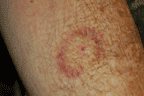 It appeared benign. The dull reddish purple softened in color, and as it did so I noticed a tiny reddish-black spot emerging in the center. A day later, the blemish had just about disappeared, which was good. Not so good was what remained: a dull reddish ring with that spot in the center.