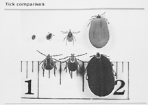 The common dog tick is at the bottom. Left to right, you see the adult male, adult female with more prominent white horseshoe collar and engorged adult female.