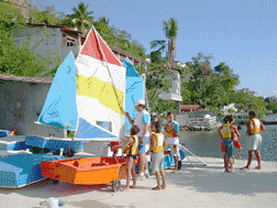 Instructor and children from the local favelas rig an Optimist for sailing at the Grael Project.